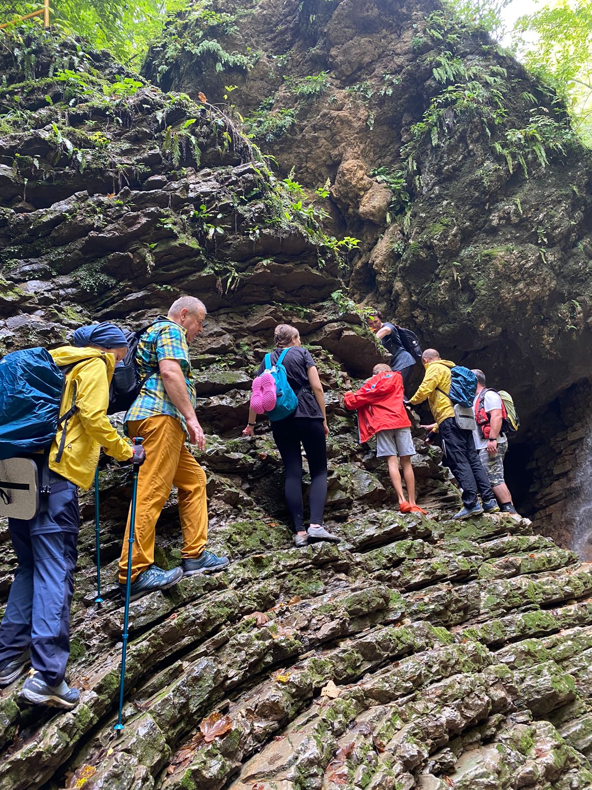 Гид обращает внимание на форму пород, показывает характерные геологические линии и рассказывает, как формировался этот участок Кавказа. Множество мест для фото.