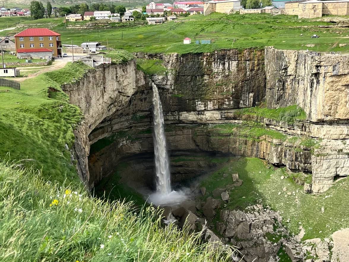 Утро начинаем на плато Хунзах — у водопада Тобот, одного из самых узнаваемых символов Дагестана. Вода срывается с отвесной скалы, и именно здесь особенно ощущается масштаб Хунзахского плато.